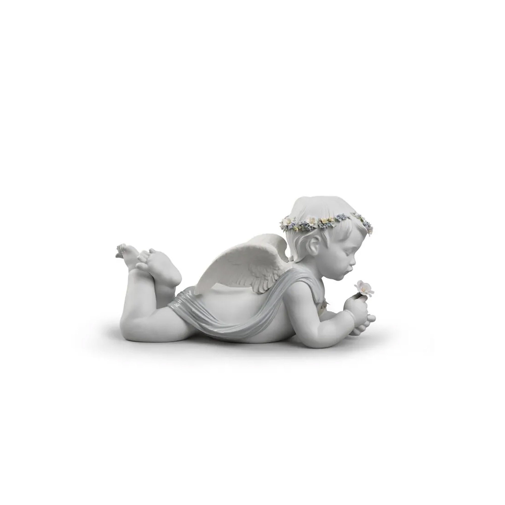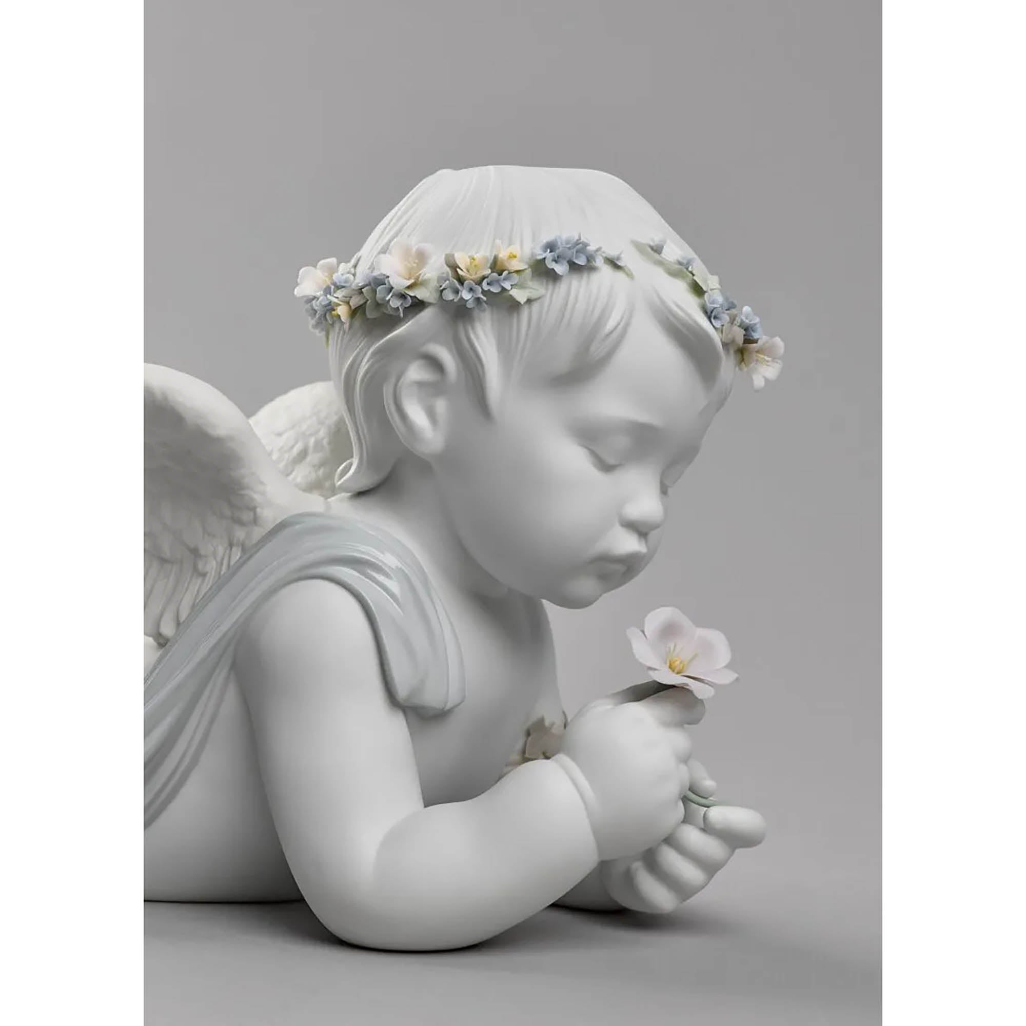 An angelic creature, realistic and yet at the same time idealised, as earthly as it is heavenly. A matte porcelain piece decorated in soft pastel colours, which stands out for its exquisite modelling and for its flowers, carefully crafted petal by petal.